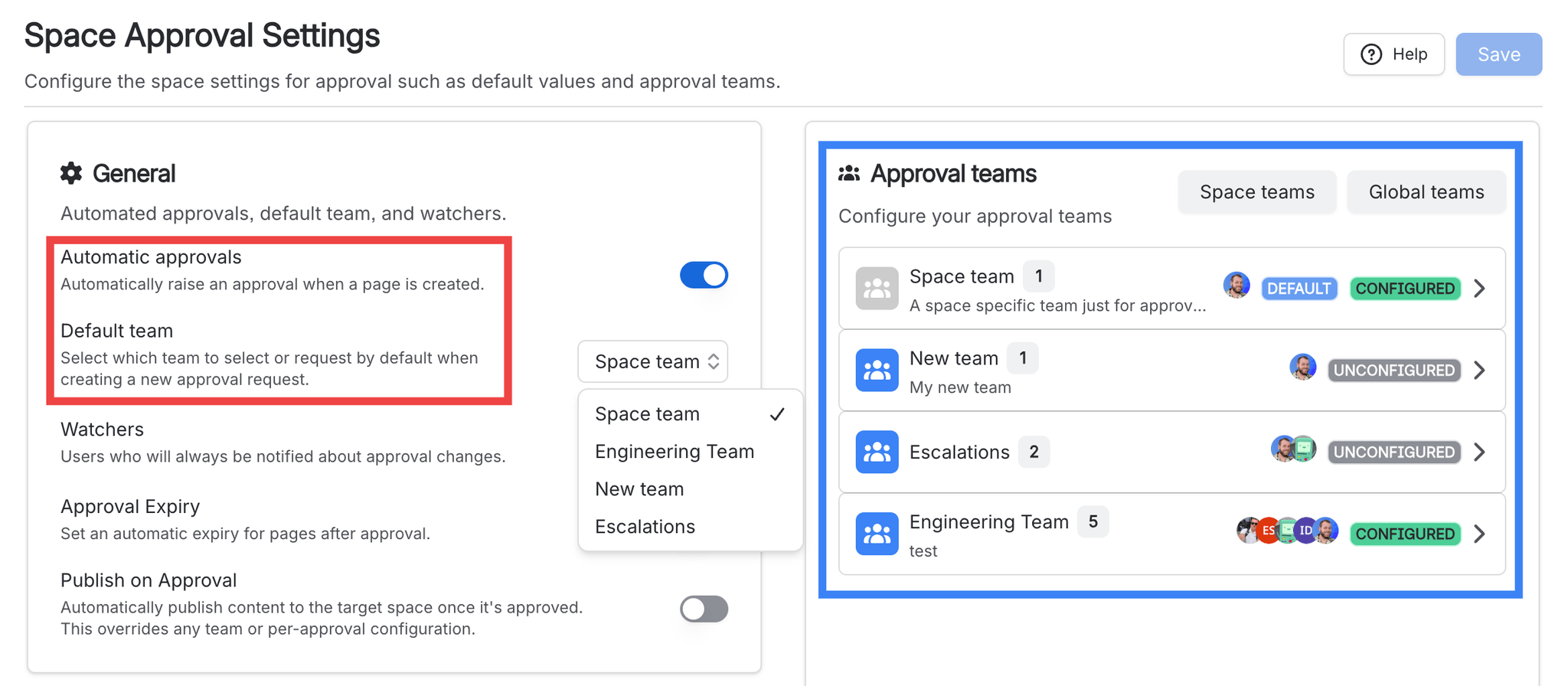 Approval teams define who reviews and approves pages. Each team can be configured separately. They are defined at either the global or space level and can be composed of a list of users, or backed by a Confluence group (e.g. from Active Directory).