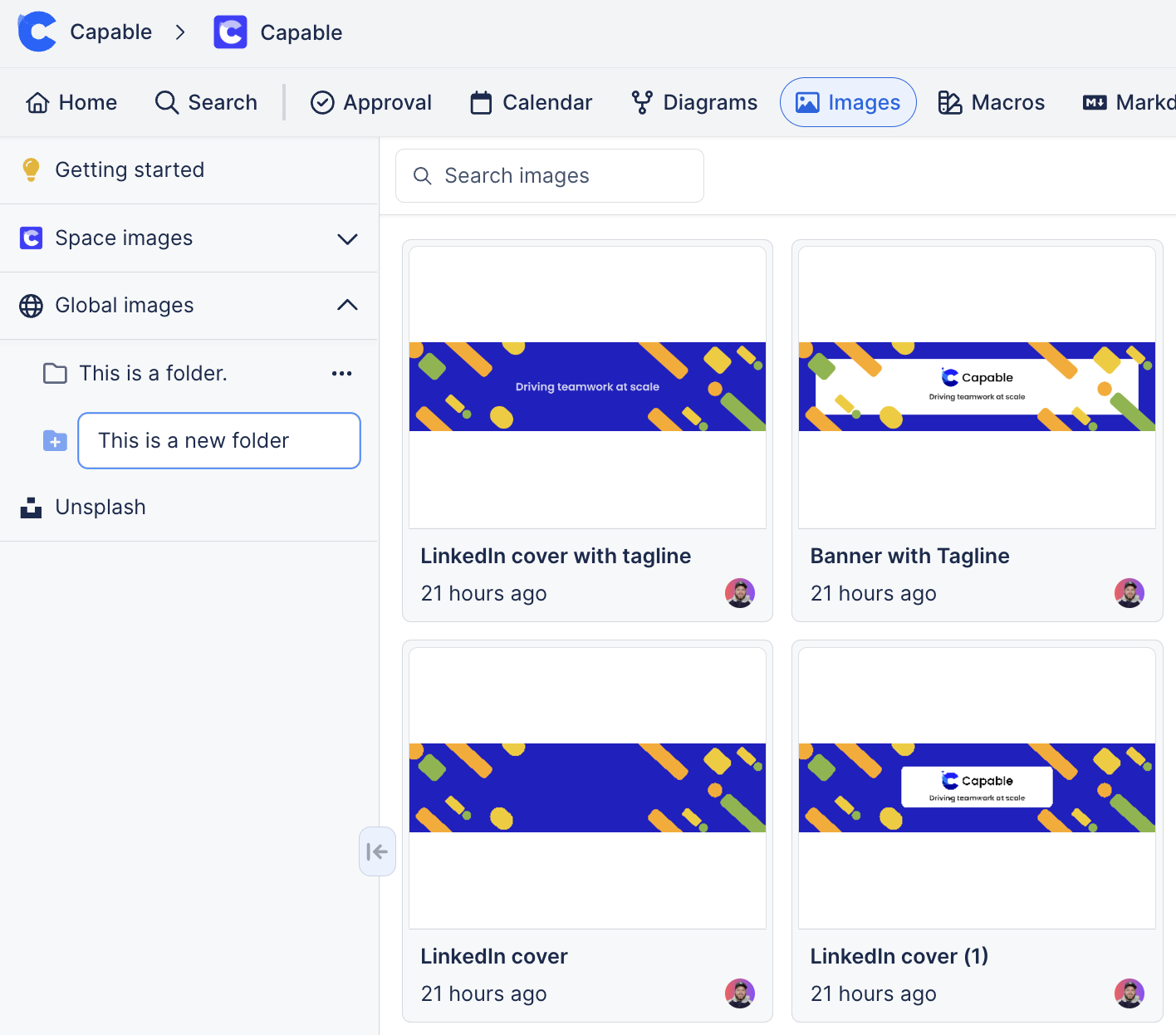 Folder Structure: Create folders for images at the global or space level to organize content by project, team, or purpose.